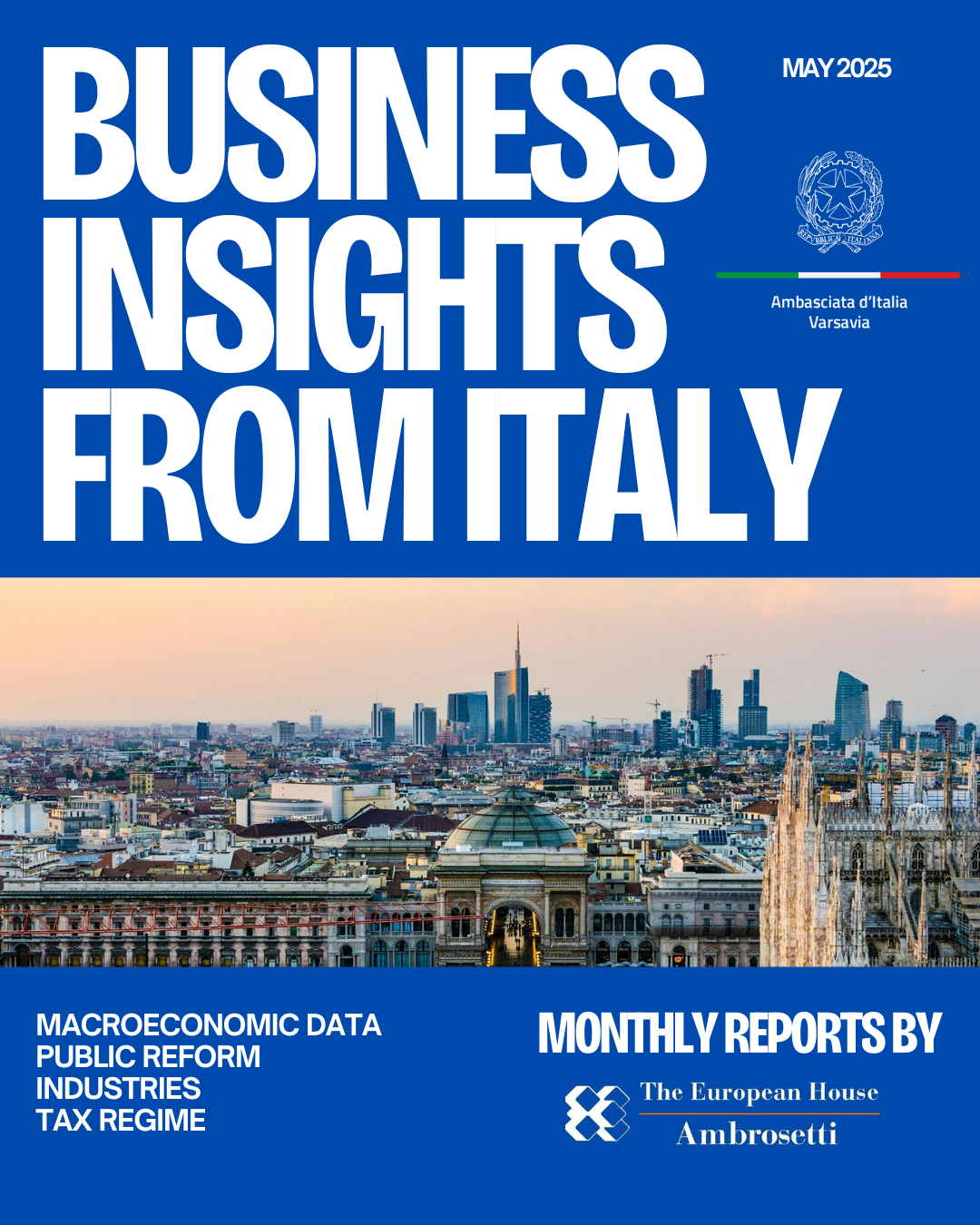 L’Ambasciata d’Italia in Polonia è lieta di presentare una nuova risorsa pensata per imprese, investitori e istituzioni interessati a commerciare con l’Italia o a investirvi. L’edizione di maggio 2025 di Business Insights from Italy, realizzata da The European House – Ambrosetti, uno dei principali think tank europei nei settori della strategia, dell’economia e delle politiche pubbliche e disponibile per il download in questa pagina, offre una panoramica sintetica e aggiornata del contesto economico italiano, delle più recenti riforme governative e delle numerose opportunità attualmente disponibili per i partner internazionali.